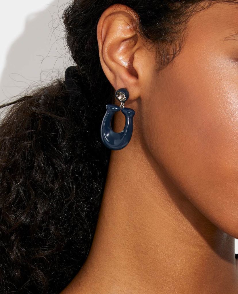 The Coach Large Signature Enamel Earring in navy with Crystal Stud brings bold elegance to any outfit. Featuring the brand’s signature motif in a smooth, glossy enamel finish, these earrings stand out with their rich navy hue that instantly elevates casual and dressy ensembles alike. A shimmering crystal sits at the center, adding a subtle yet eye-catching shine. Lightweight and comfortable for all-day wear, they offer a perfect blend of modern flair and timeless sophistication. Ideal for adding a stylish statement to your everyday accessory collection.