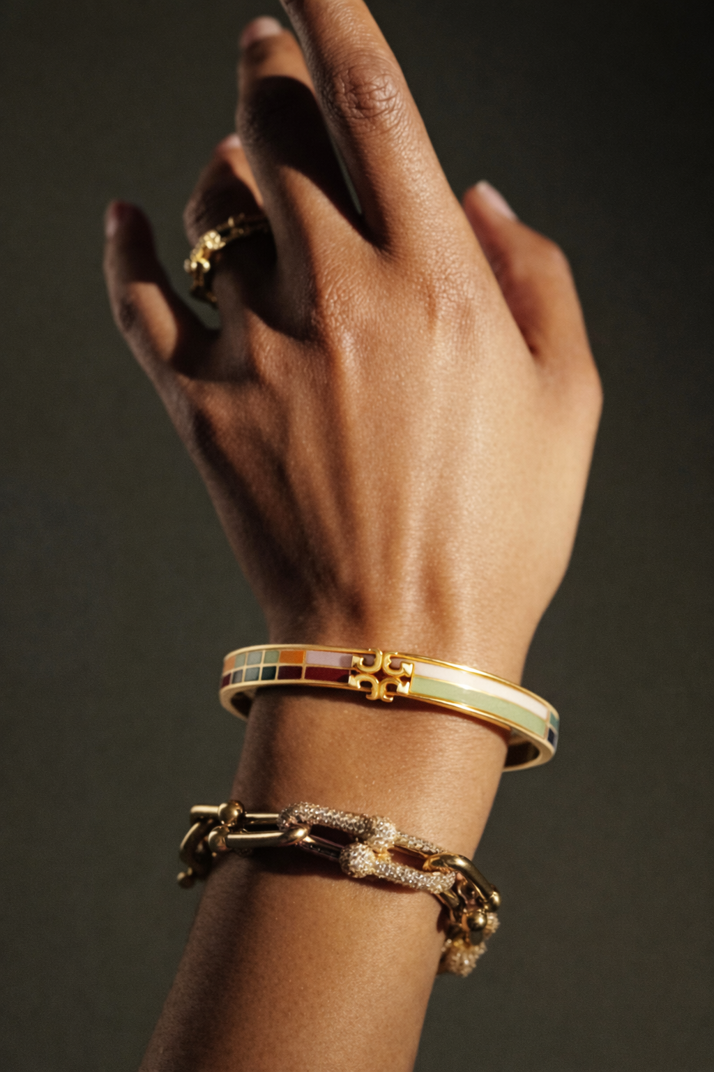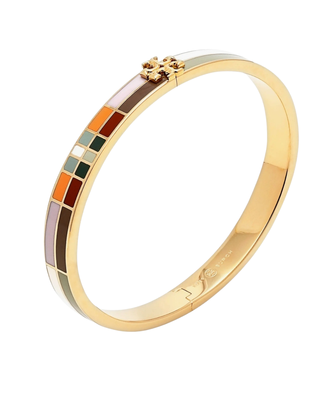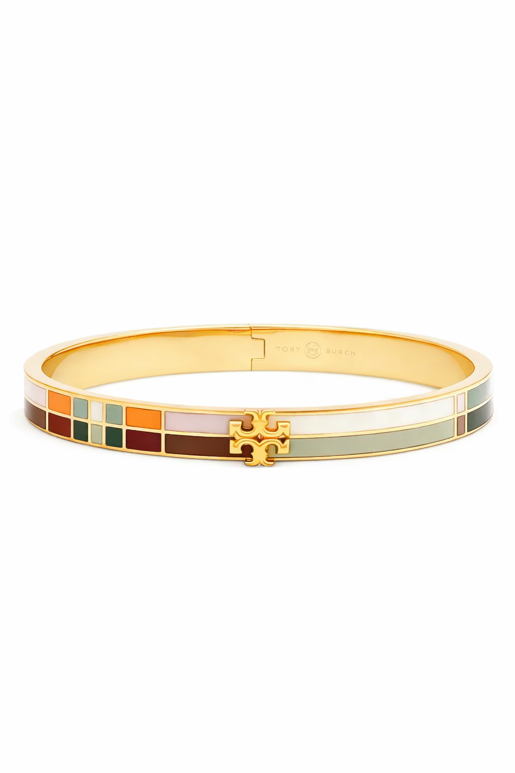 Add a refined pop of color to your wrist stack with this elegant gold-tone hinged bangle. Designed with a sleek, polished finish, it features a vibrant mosaic of enamel tiles in earthy and pastel hues, beautifully arranged for a modern yet timeless appeal. The iconic cut-out logo centerpiece adds a signature touch, while the slim silhouette keeps it effortlessly sophisticated.