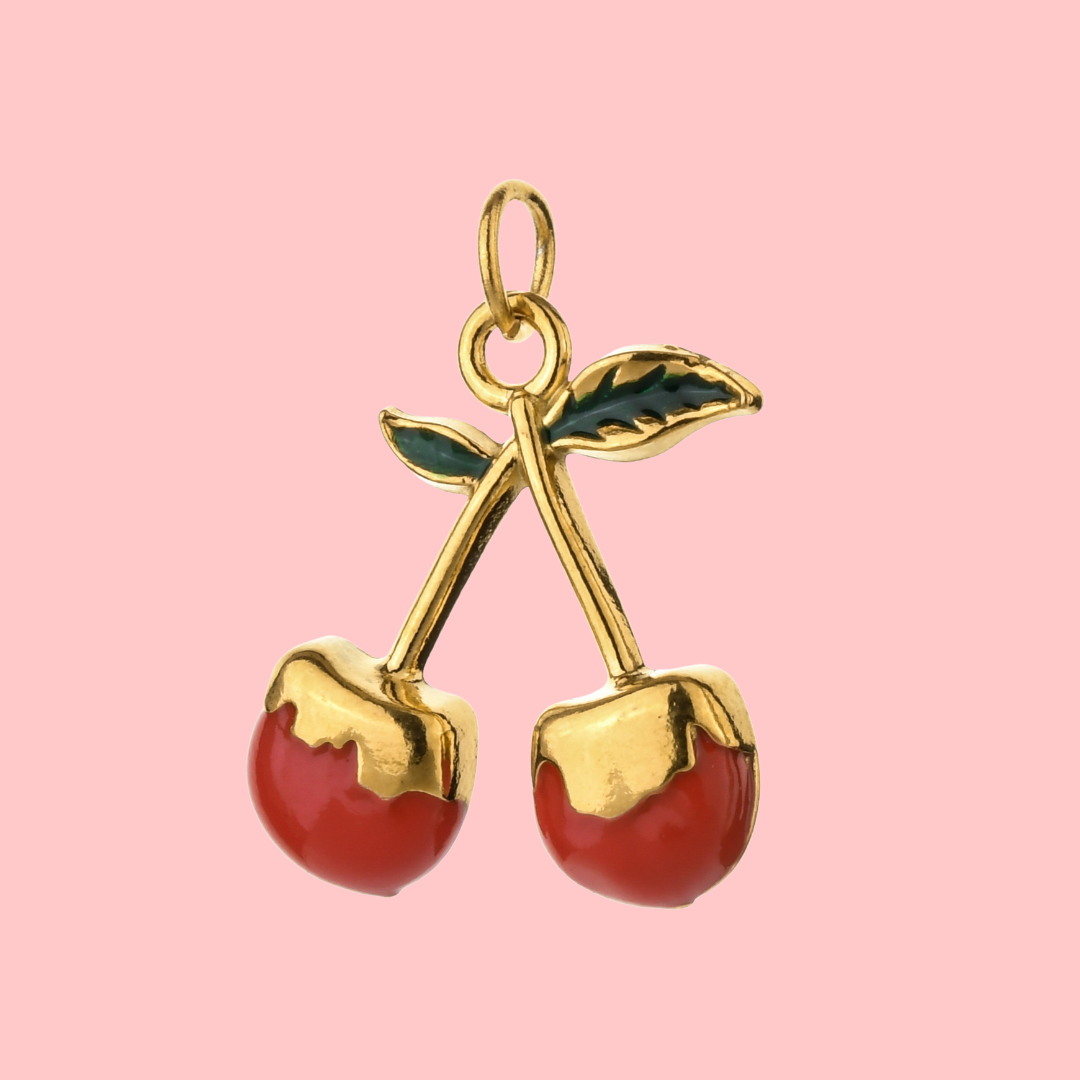 Sweeten up your jewellery collection with this playful double-cherry charm. Designed with glossy red enamel cherries topped with a rich gold-tone βdripβ effect and finished with delicate green enamel leaves, it brings a fun, fruity pop of colour to any bracelet or necklace. Perfect for creating a bold summer look or adding a quirky accent to your everyday style.