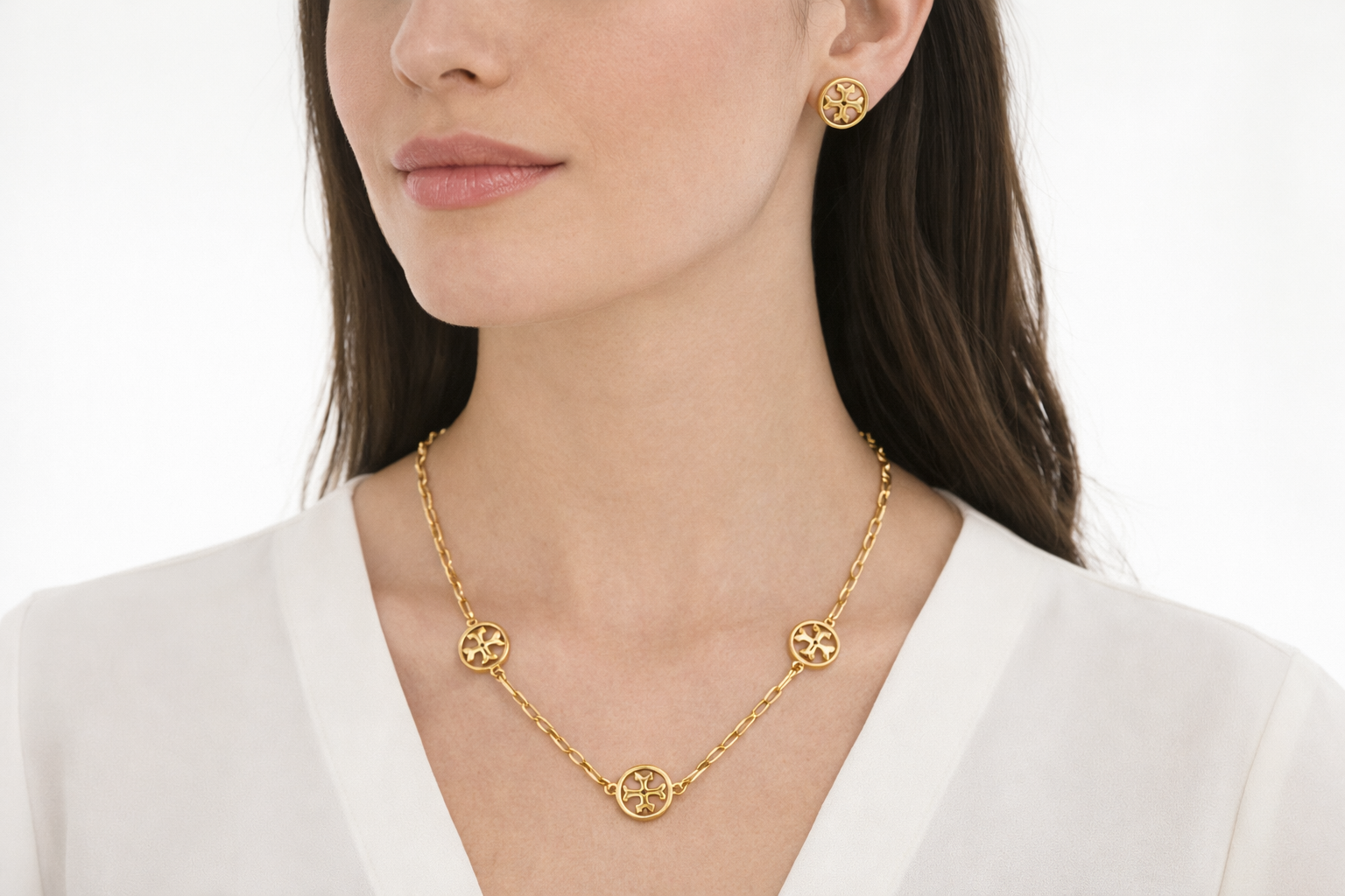 Elevate your everyday elegance with this timeless gold medallion jewelry set. Featuring a delicately crafted necklace and matching stud earrings, this piece blends minimalist sophistication with subtle statement appeal.