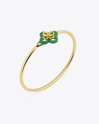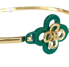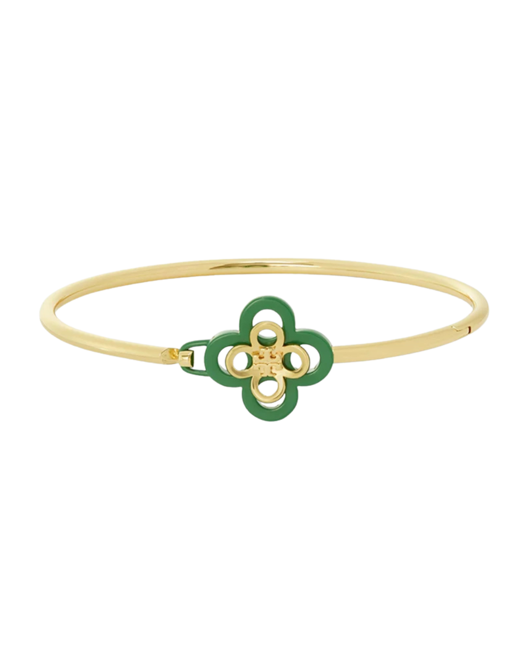 Delicate with a touch of charm, this green clover bangle bracelet adds a subtle pop of color to your everyday style. Crafted in a sleek gold-tone finish, the slim bangle is accented with a petite green enamel clover motif for a playful yet elegant look. Its minimalist silhouette makes it perfect for stacking with other bracelets or wearing solo for a refined statement. Lightweight and versatile, this piece effortlessly complements both casual and dressy outfits.