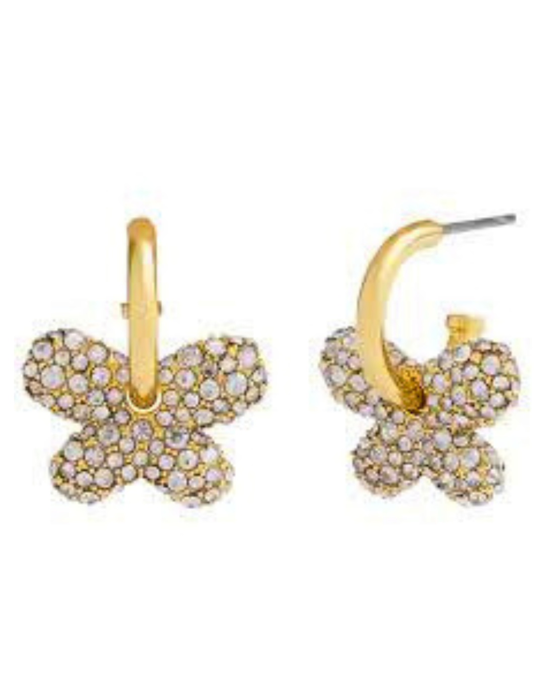 Add a touch of sparkle and charm to your jewelry collection with these gold-tone pavé butterfly huggie earrings. Featuring a delicate butterfly charm fully encrusted with shimmering crystals, this pair brings playful elegance to any look. The sleek huggie hoop design hugs the ear comfortably, making them perfect for everyday wear while still dazzling enough for special occasions. Feminine, radiant, and effortlessly stylish — these earrings are made to stand out.