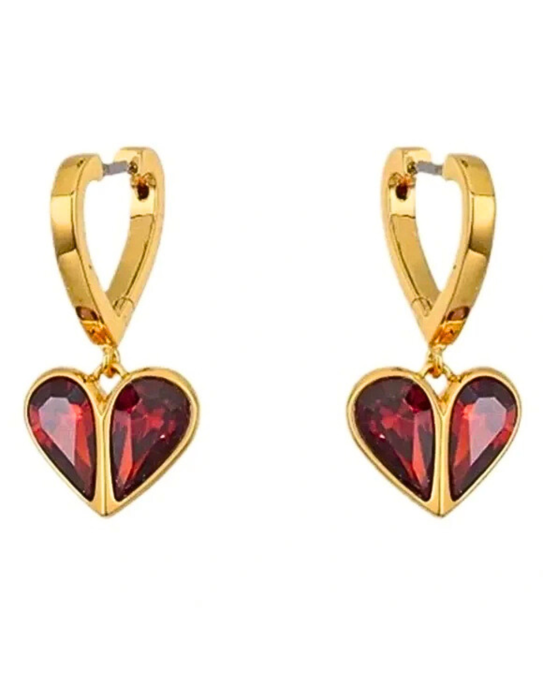 Romantic with a bold edge, these red crystal heart drop earrings are designed to stand out. Featuring a sleek gold-tone huggie hoop, each earring is finished with a faceted deep-red heart charm that catches the light beautifully. The rich jewel tone paired with the polished gold setting creates a striking contrast that feels both elegant and playful. Perfect for date nights, special occasions, or whenever you want to add a little drama to your look.