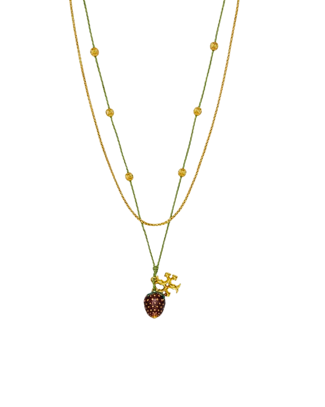 Add a playful yet elegant touch to your everyday look with the Golden Berry Layered Necklace. This beautifully curated two-layer piece features a delicate gold-tone chain paired with a soft green cord strand, finished with dainty gold bead accents. The standout detail is the charming berry pendant, complemented by a subtle gold charm—bringing a fresh, feminine vibe to your jewelry collection.