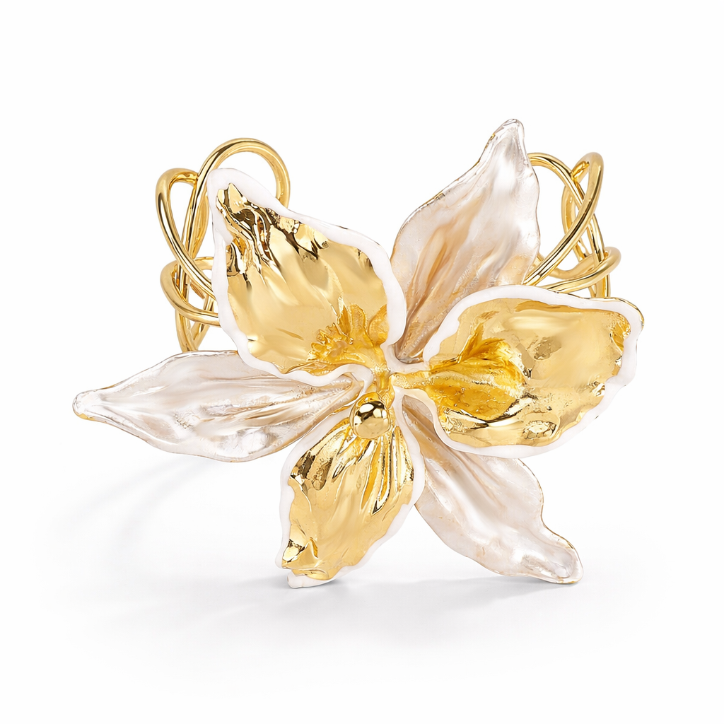Bold, artistic, and effortlessly elegant, the Golden Orchid Statement Bangle is designed to make a lasting impression. Inspired by the delicate beauty of orchid petals, this sculptural piece features luminous gold tones paired with soft translucent accents that capture and reflect light beautifully.