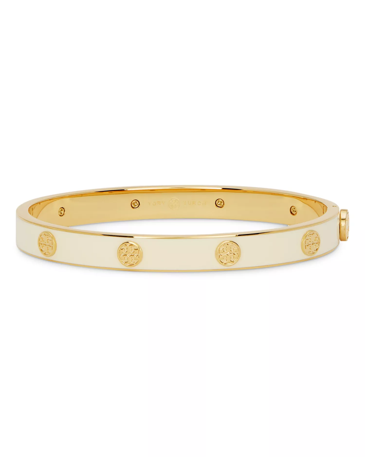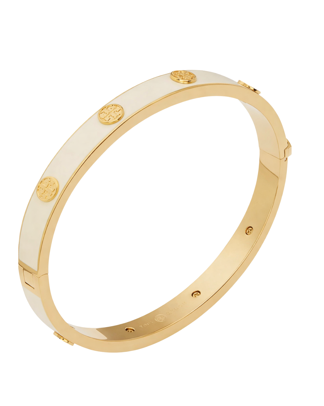 Refined and effortlessly elegant, this gold-tone hinged bangle features a smooth ivory enamel inlay accented with evenly spaced signature logo medallions. The polished finish enhances its luxurious appeal, while the structured silhouette delivers a timeless, sophisticated look.