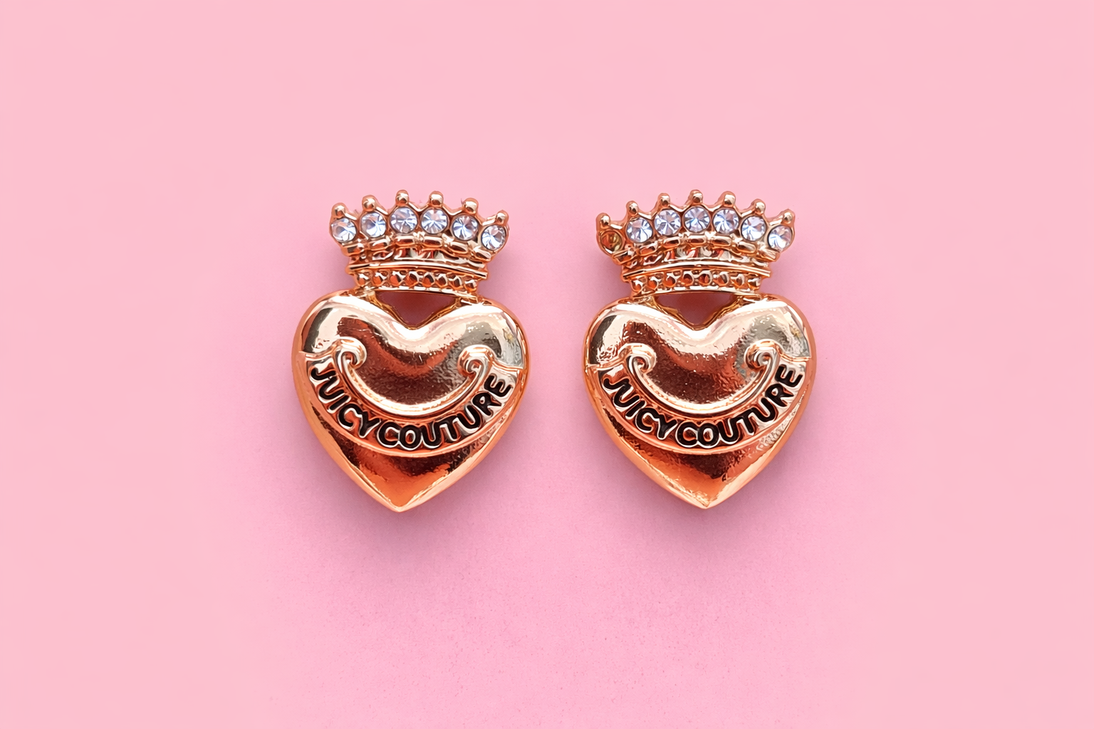The set is paired with matching Juicy Couture heart stud earrings topped with a crown design and crystal accents, giving it a stylish and glamorous finish.