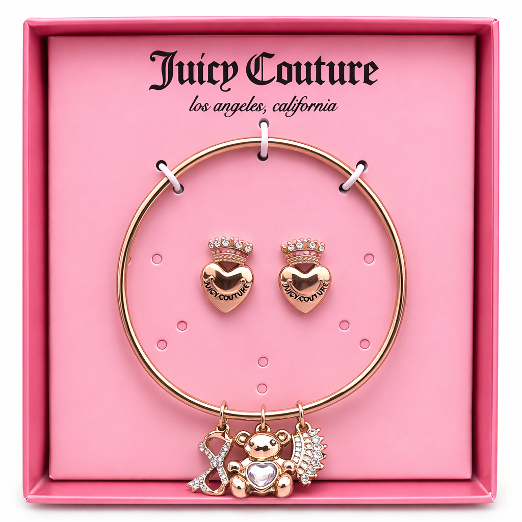 Add a playful touch of luxury to your jewelry collection with this Juicy Couture Heart Earrings and Charm Bracelet Set. Designed with Juicy Couture’s signature feminine style, this beautiful set features a sleek gold-tone bangle bracelet adorned with sparkling charms, including a crystal-studded letter charm and a cute teddy bear charm with a heart detail.