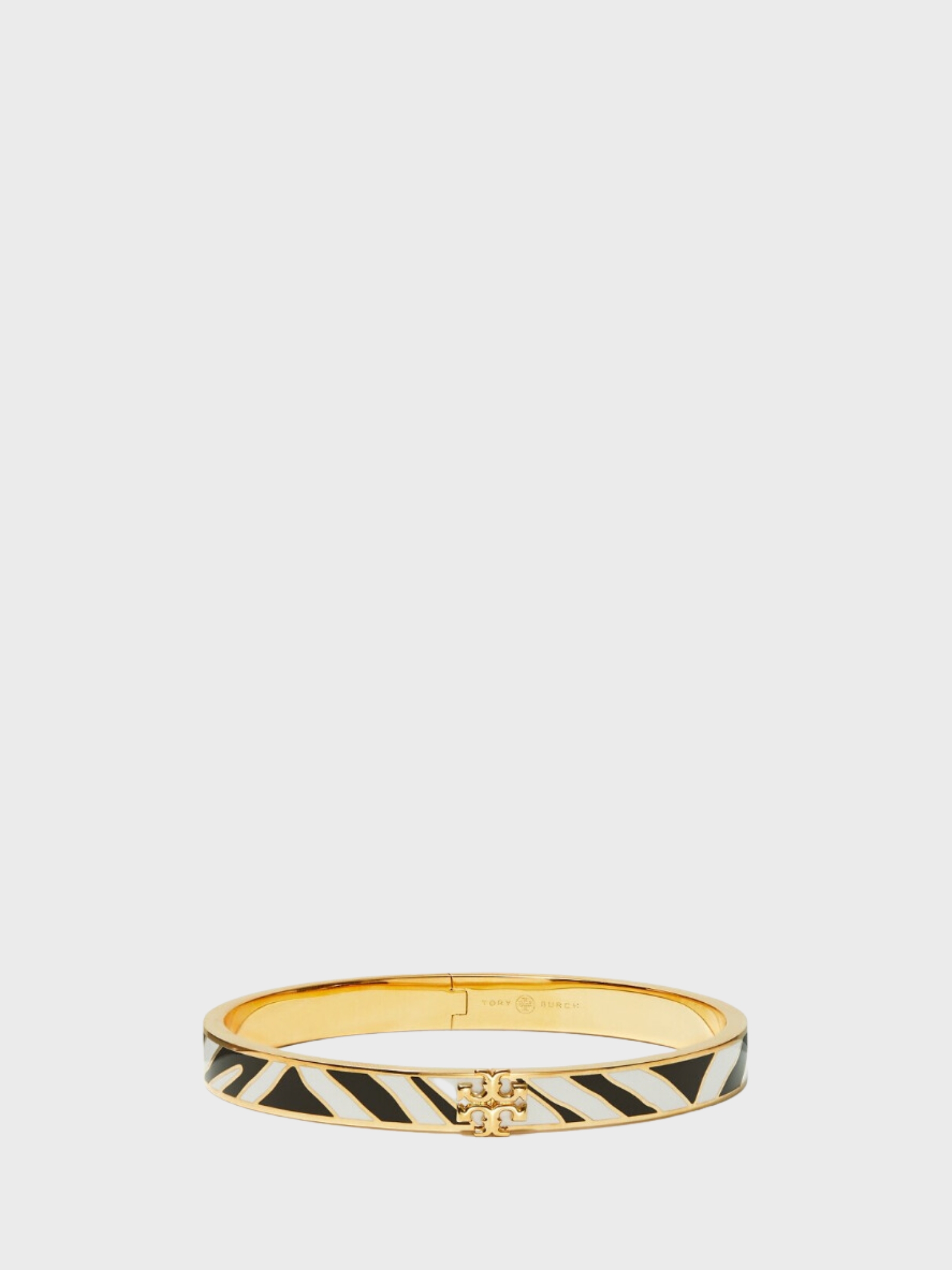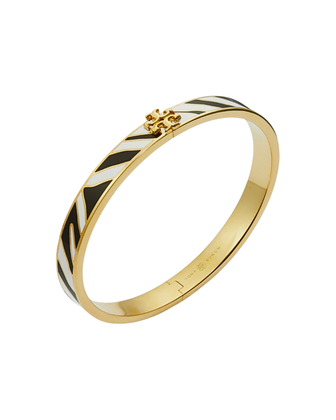 Bold yet refined, the Kira Chevron Stripe Enamel Hinge Bracelet brings graphic elegance to your everyday stack. Designed with sleek enamel chevron striping framed in a polished gold-tone finish, this piece blends modern structure with timeless sophistication. The iconic logo detail sits gracefully at the center, adding a signature touch without overwhelming the clean design.