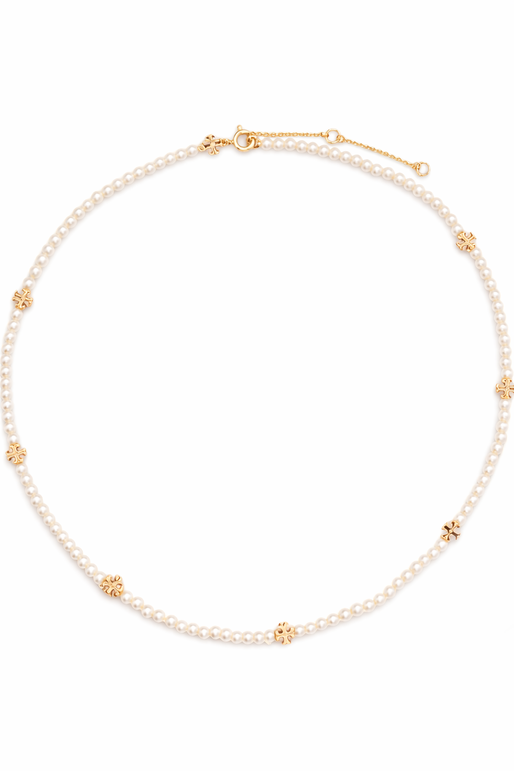 Designed with a strand of luminous mini pearls, this piece is accented with subtle gold-tone charms that bring a soft, stylish edge. Lightweight and versatile, it sits beautifully on the neckline, making it ideal for both everyday wear and special occasions.