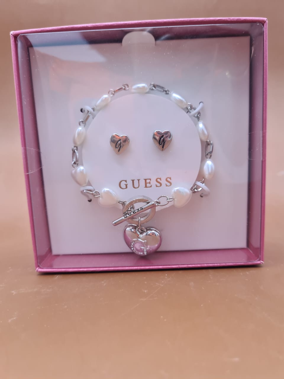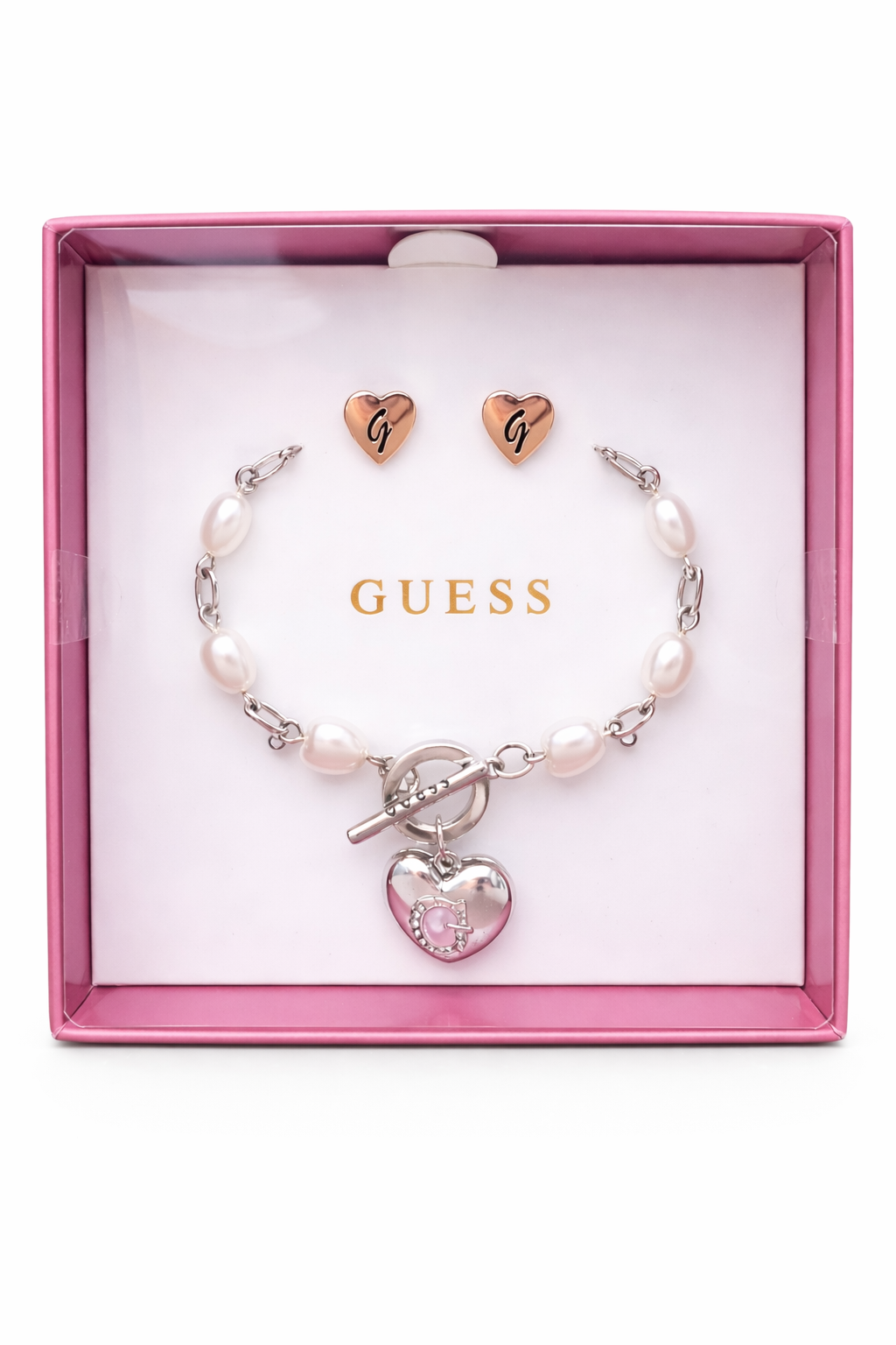 The bracelet features a beautiful combination of freshwater-style pearls and polished silver-tone heart links, finished with a stylish Guess heart charm clasp. Paired with matching Guess heart stud earrings, this set creates a coordinated, feminine look that effortlessly elevates any outfit.