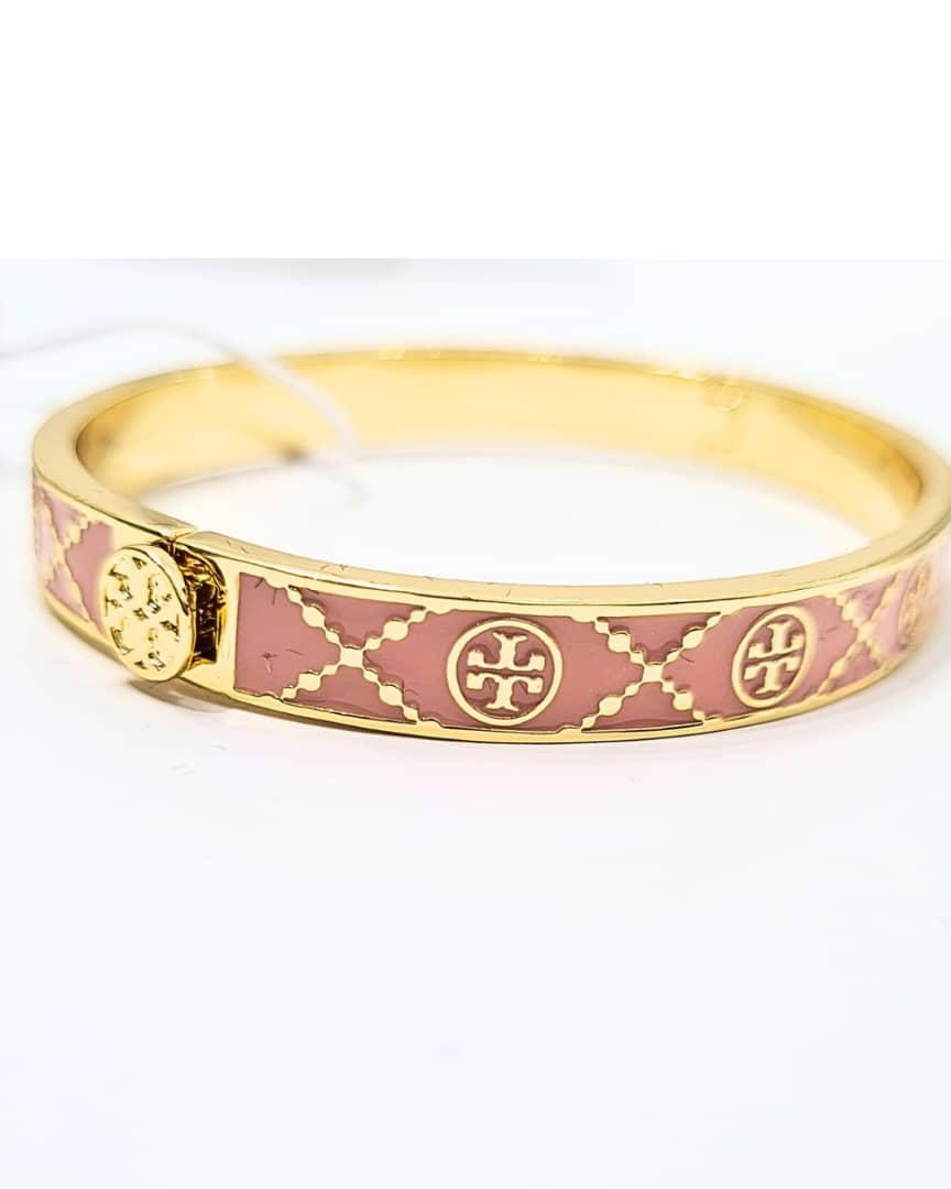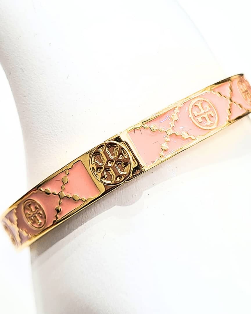 Elevate your wrist stack with this chic pink monogram hinge bangle. Designed with a glossy enamel finish and a bold signature logo at the center, it adds a refined yet playful touch to any outfit. The sleek hinge closure ensures a secure and comfortable fit, making it perfect for everyday wear or special occasions.