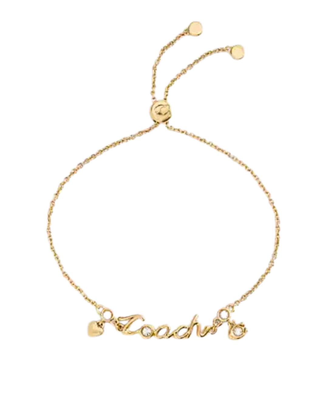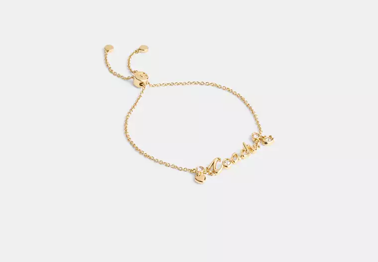 Delicate, romantic, and effortlessly stylish — the Coach Script Heart Slider Bracelet is the perfect everyday accent. Featuring a charming heart motif paired with the brand’s elegant script logo, this bracelet blends playful femininity with signature sophistication. The adjustable slider closure ensures a comfortable, customized fit, while the polished gold-tone finish adds a subtle glow to your wrist. Wear it solo for a minimal look or stack it with your favorite pieces for a layered statement.